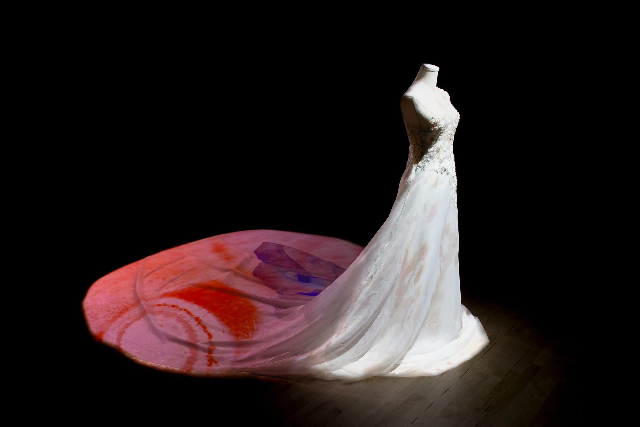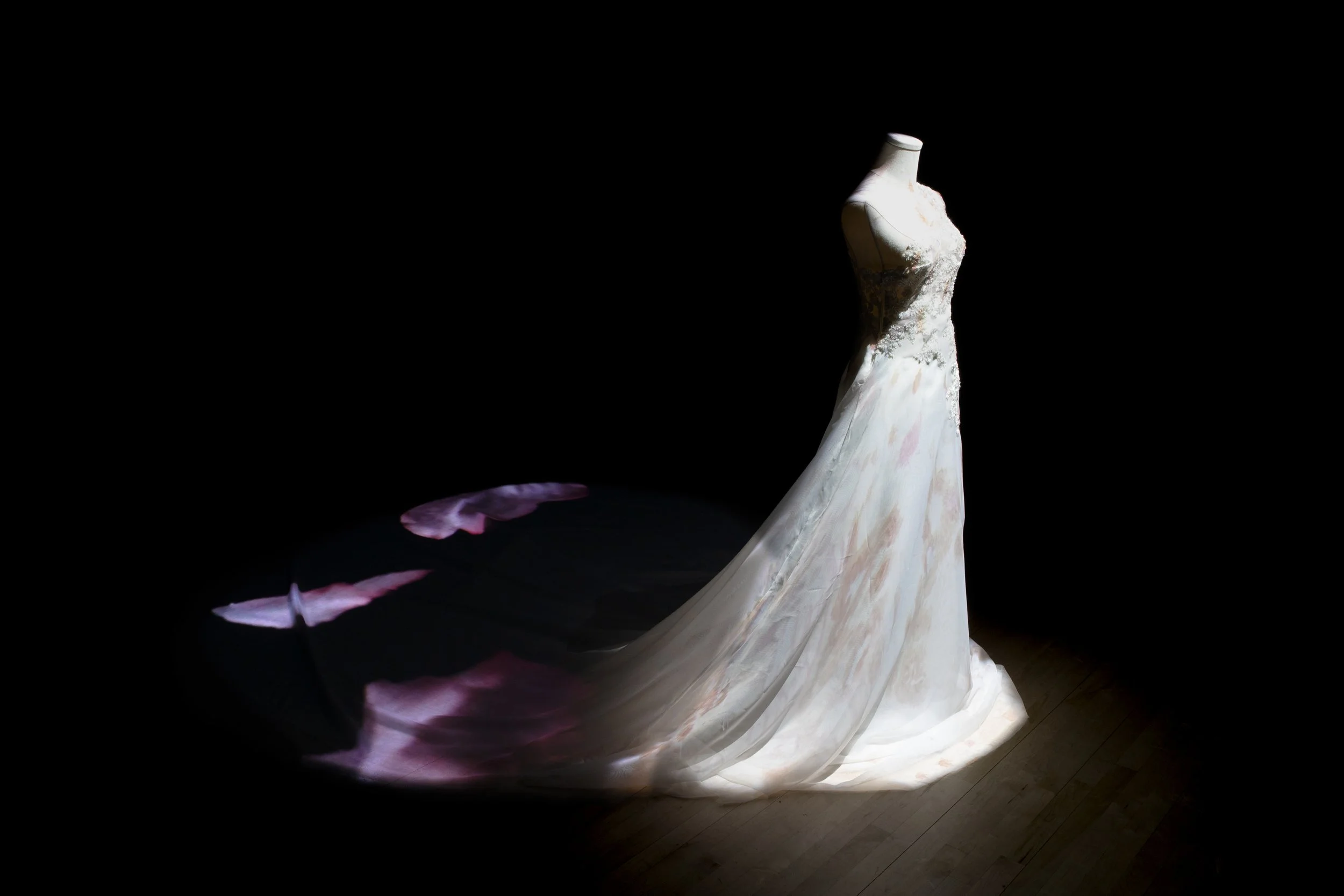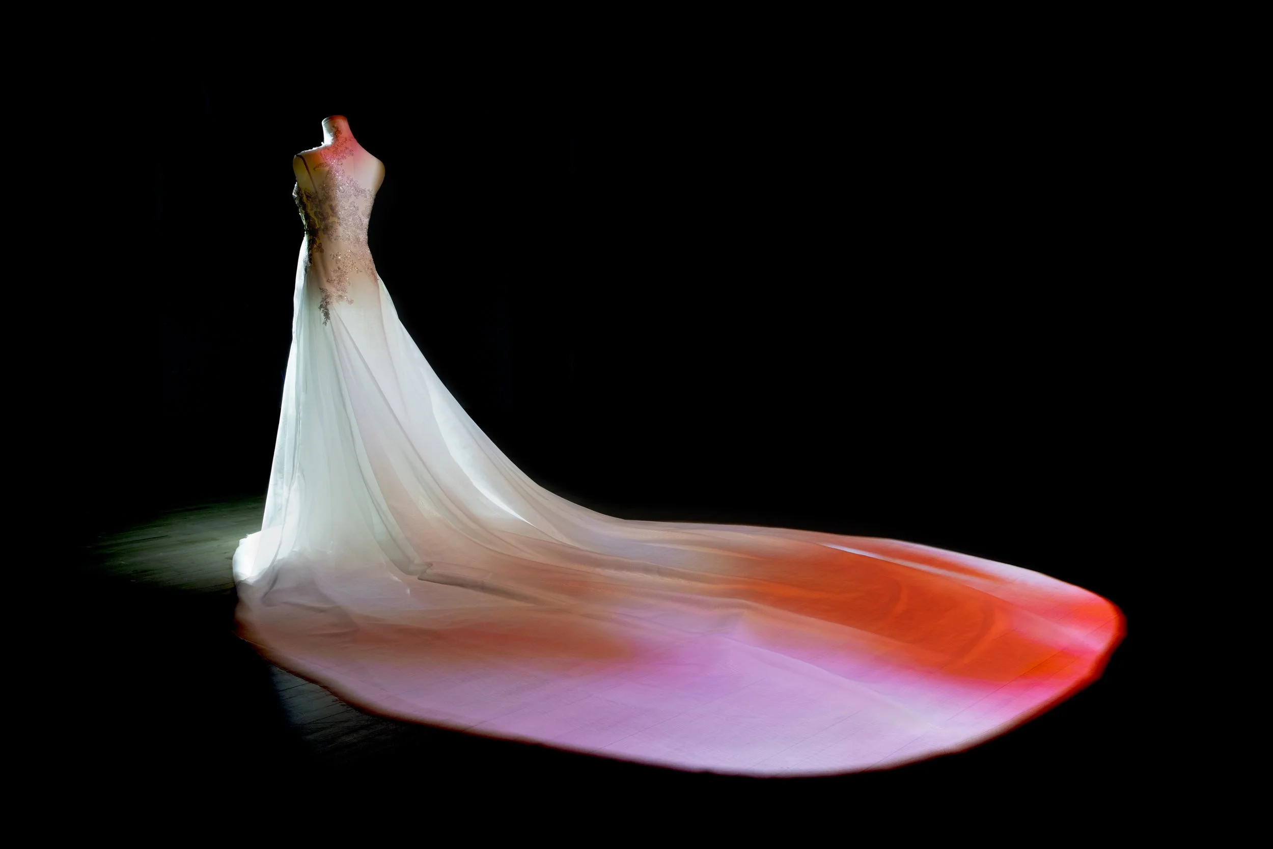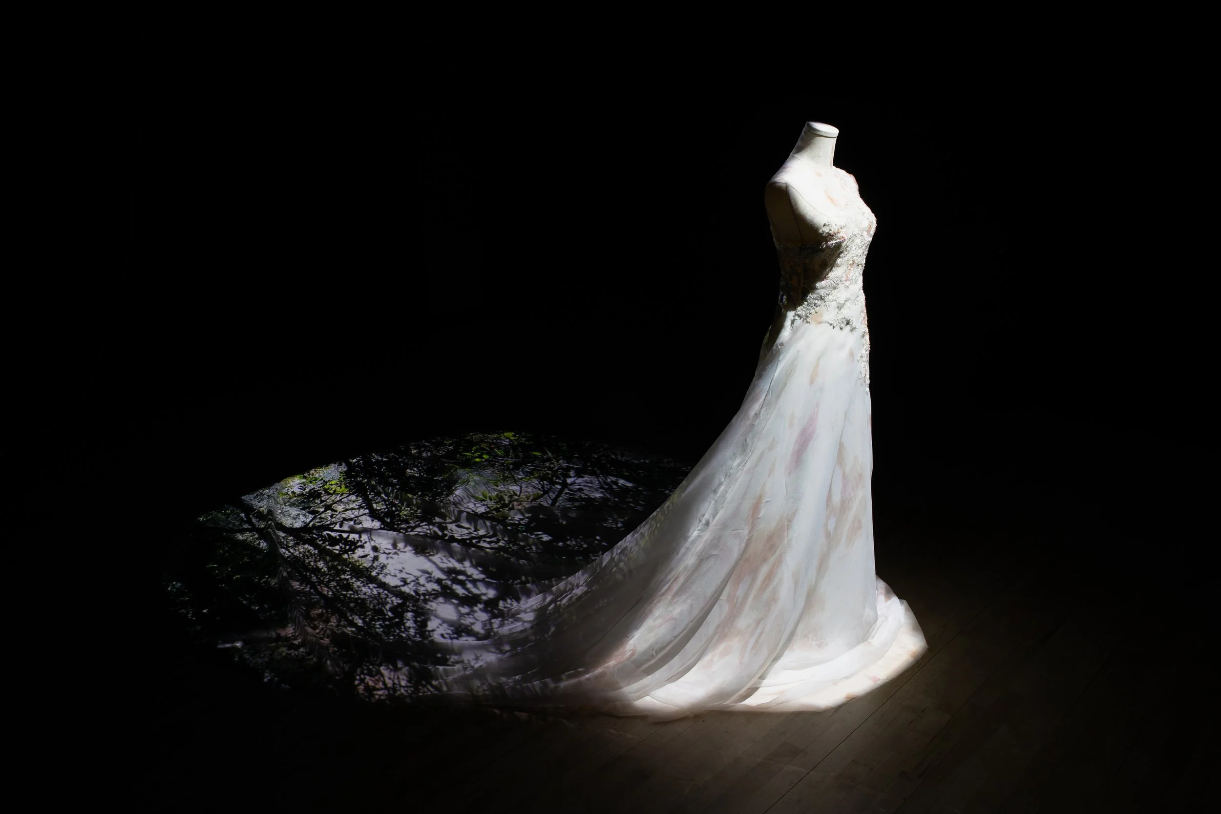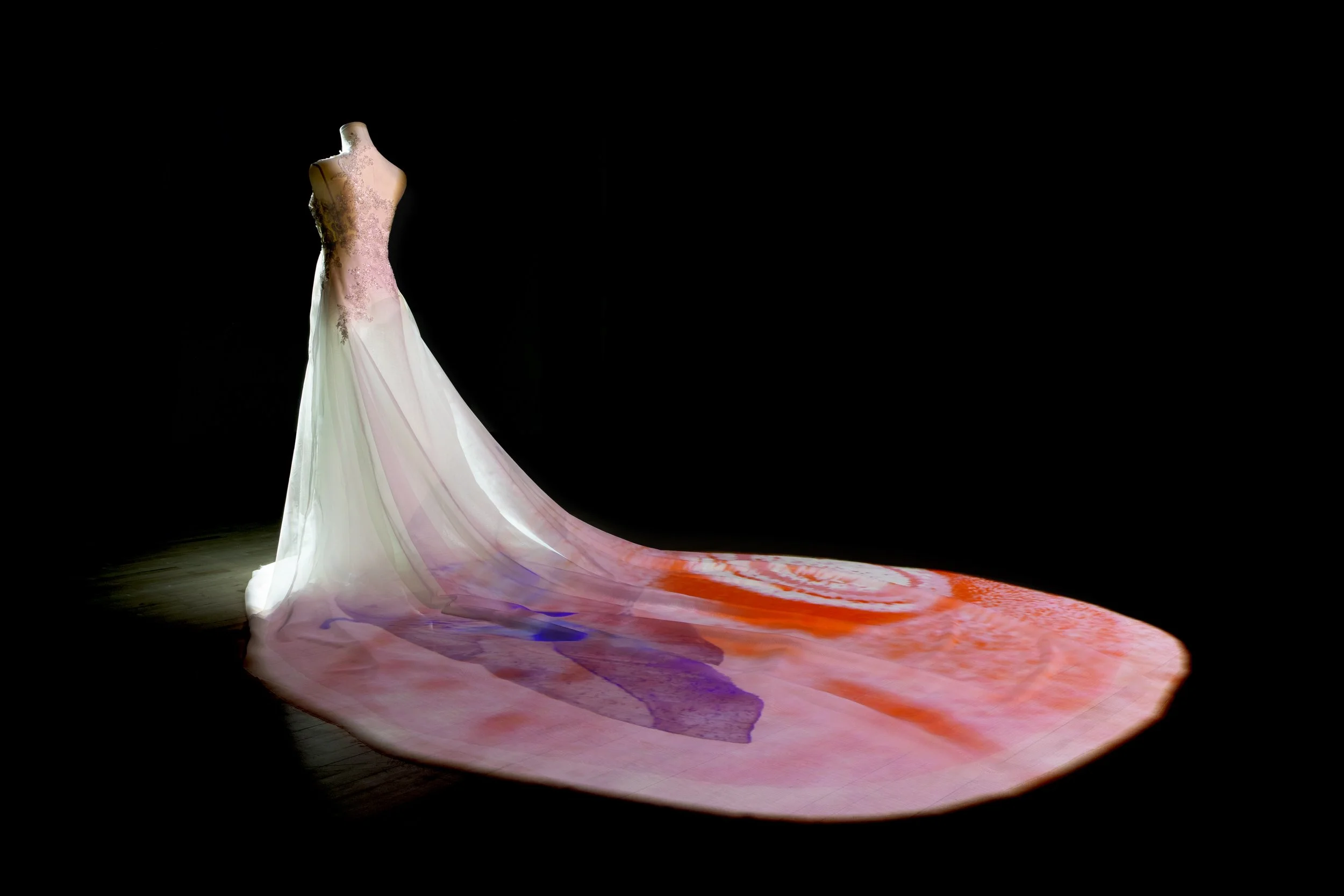 Ophrys Apifera is a video sculpture that examines the nature of love as an inherently subjective act of projection and the relationship between the subject and the object of affection. At the center of a dark, empty room stands a pure white wedding dress sculpture. Two projectors cast colorful, dynamic imagery onto the dress and its flowing train, transforming it into a canvas for layered emotions and shifting visions.