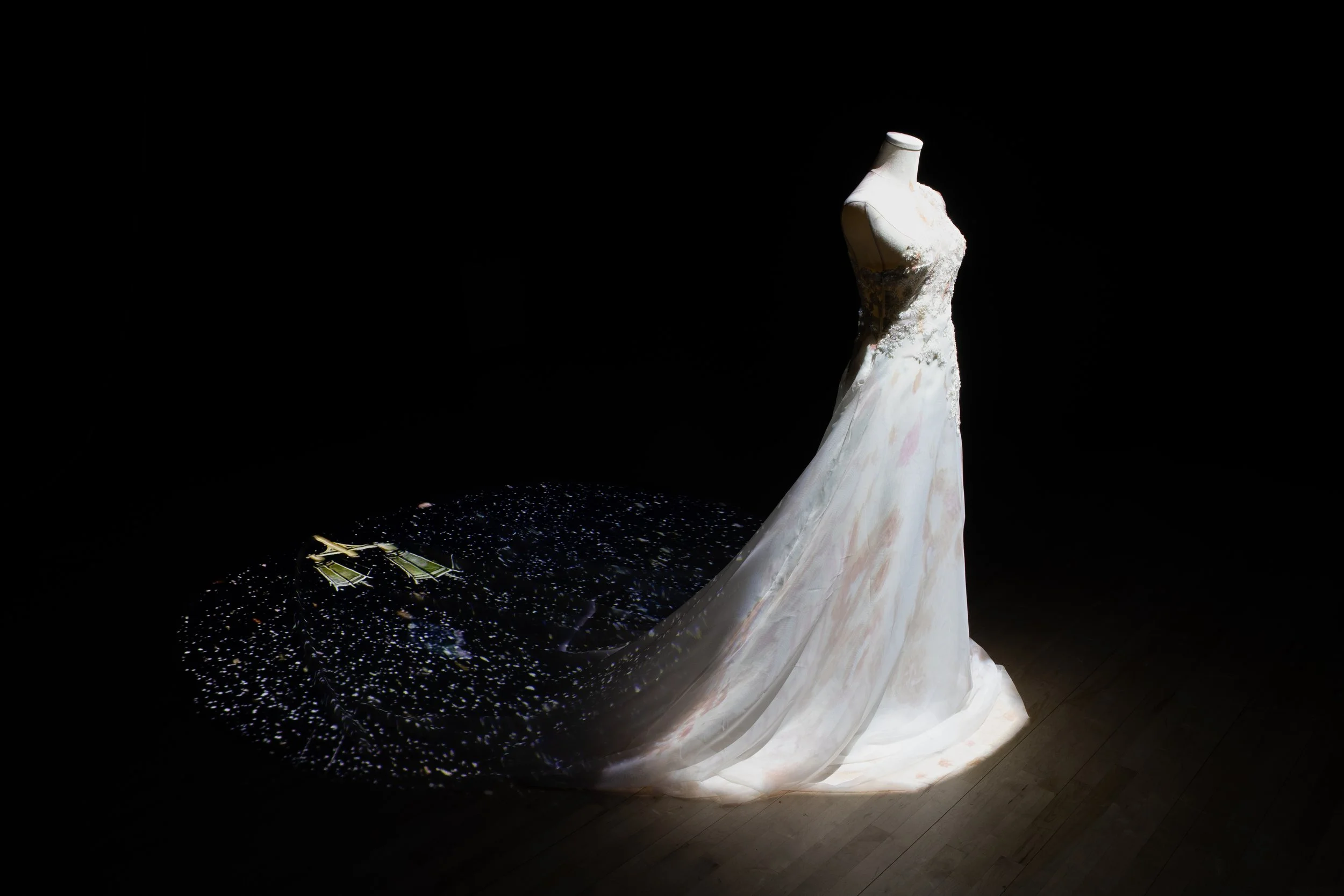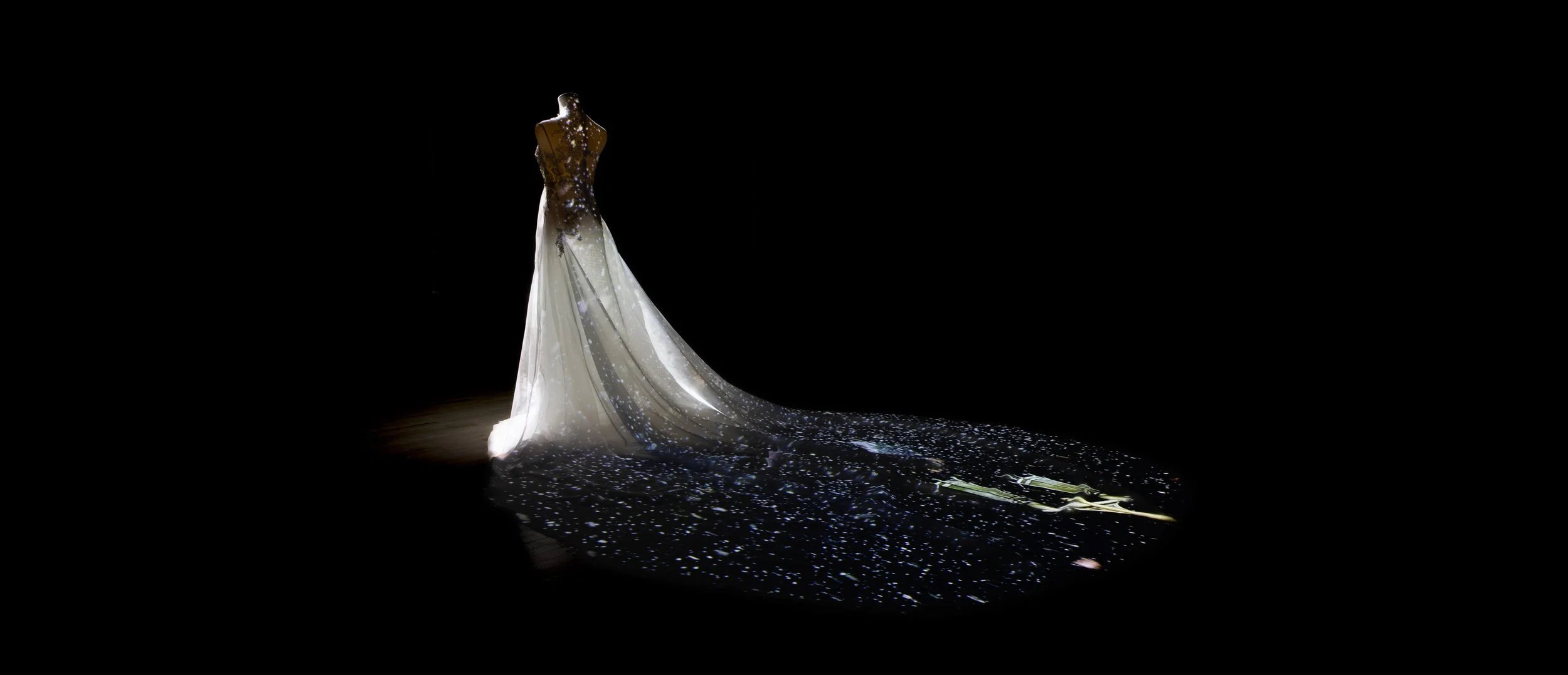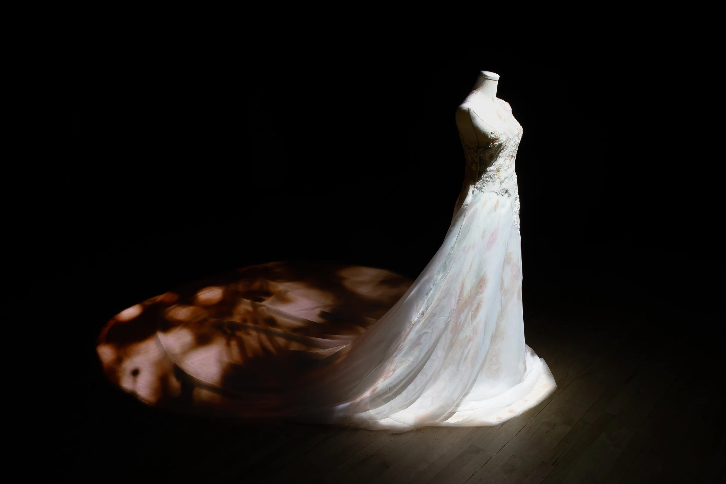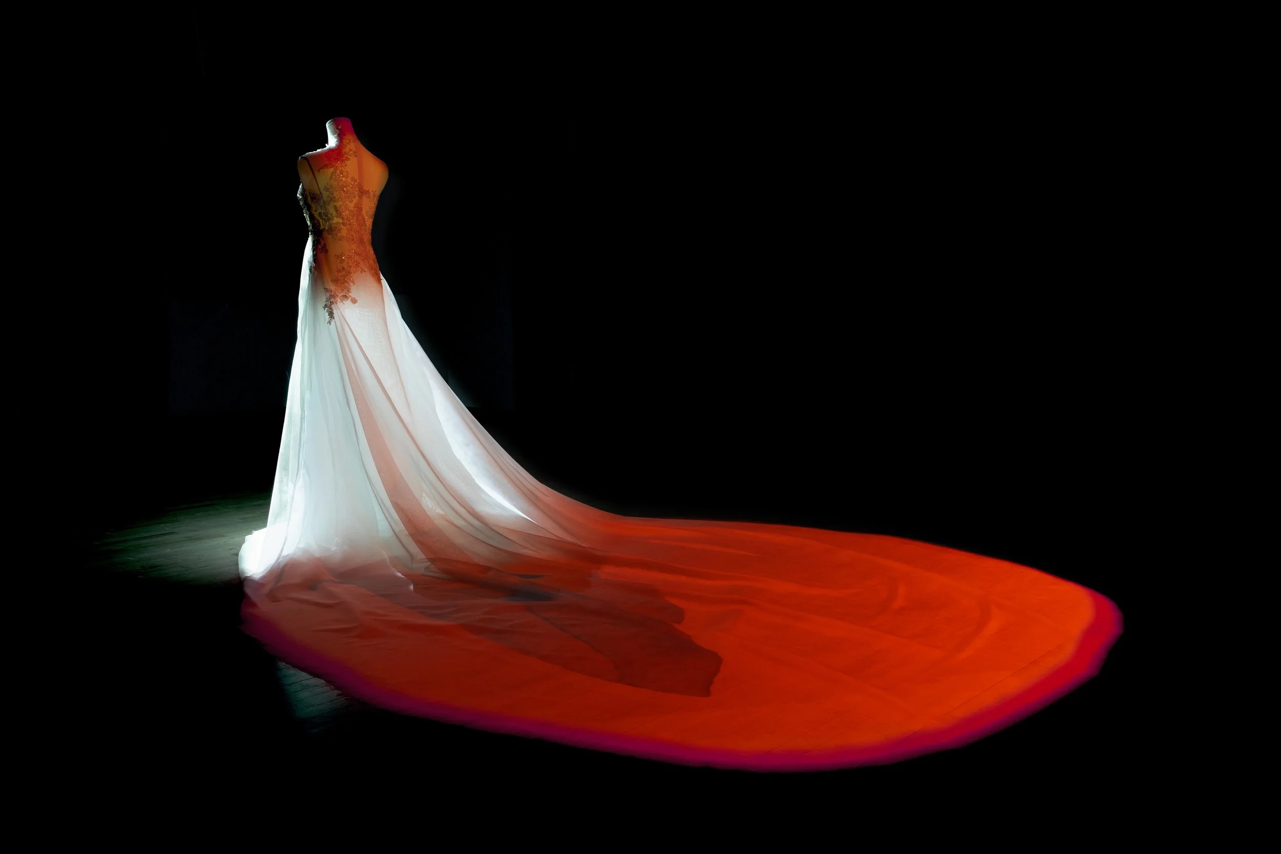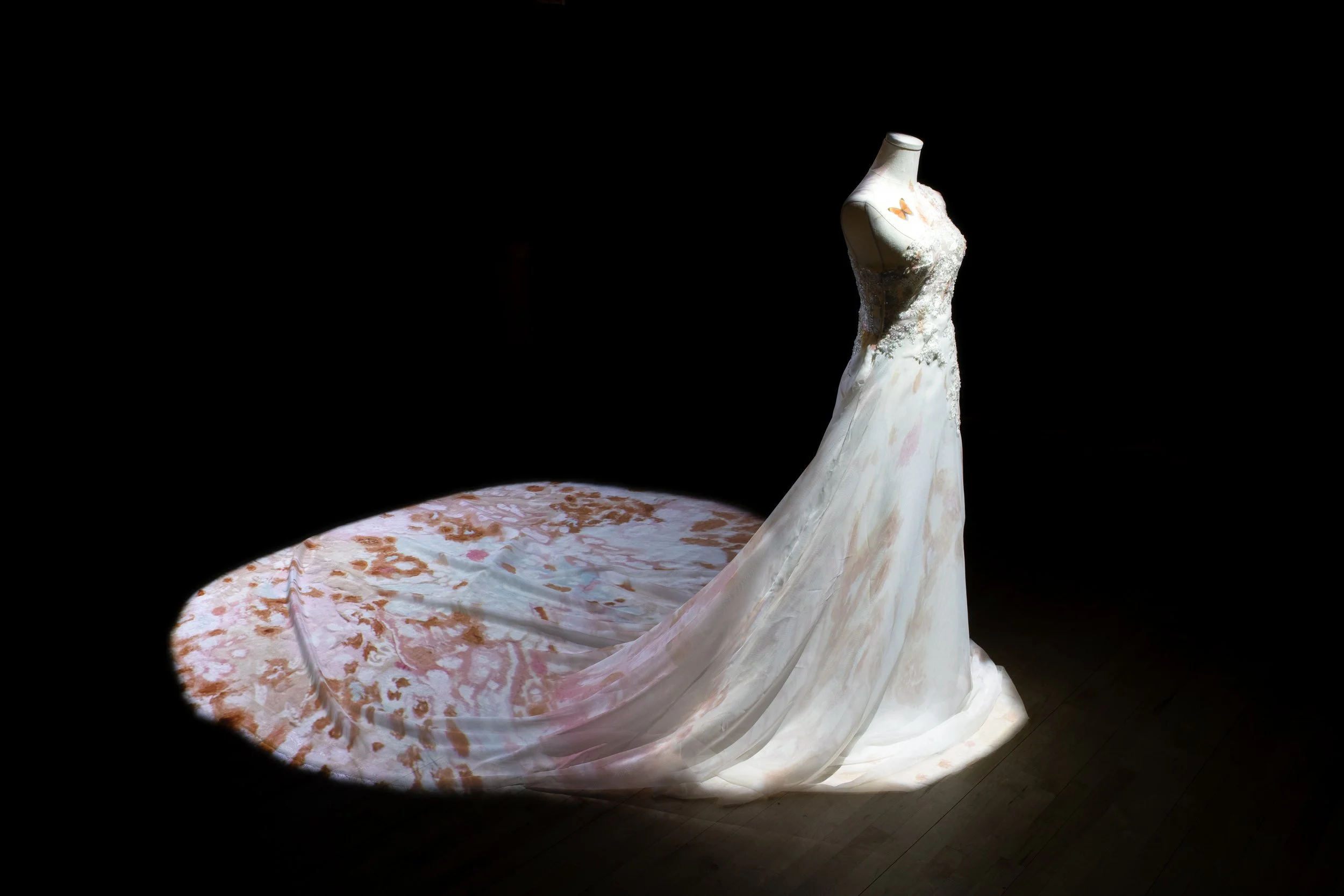 Ophrys Apifera is a video sculpture that examines the nature of love as an inherently subjective act of projection and the relationship between the subject and the object of affection. At the center of a dark, empty room stands a pure white wedding dress sculpture. Two projectors cast colorful, dynamic imagery onto the dress and its flowing train, transforming it into a canvas for layered emotions and shifting visions.