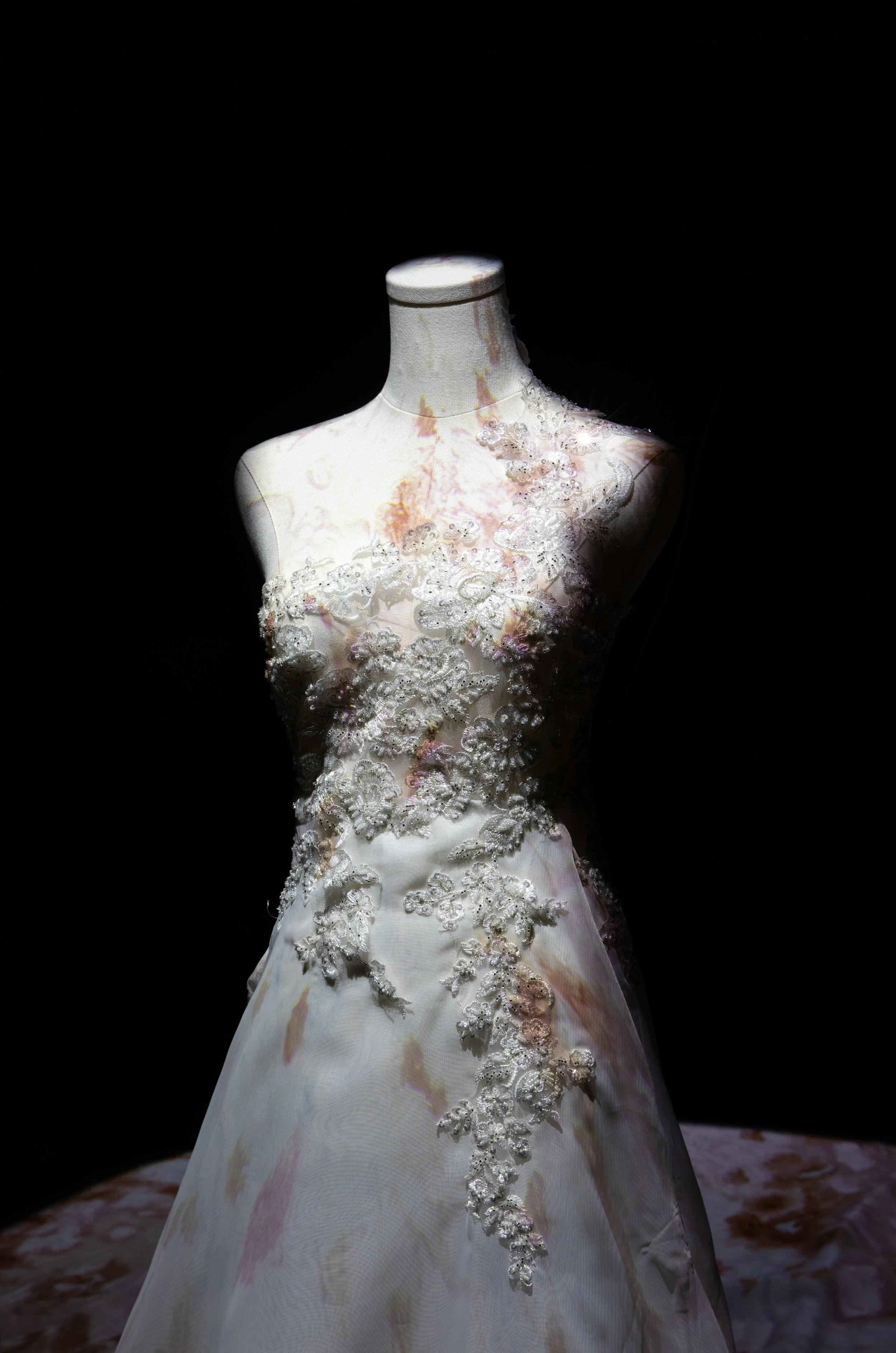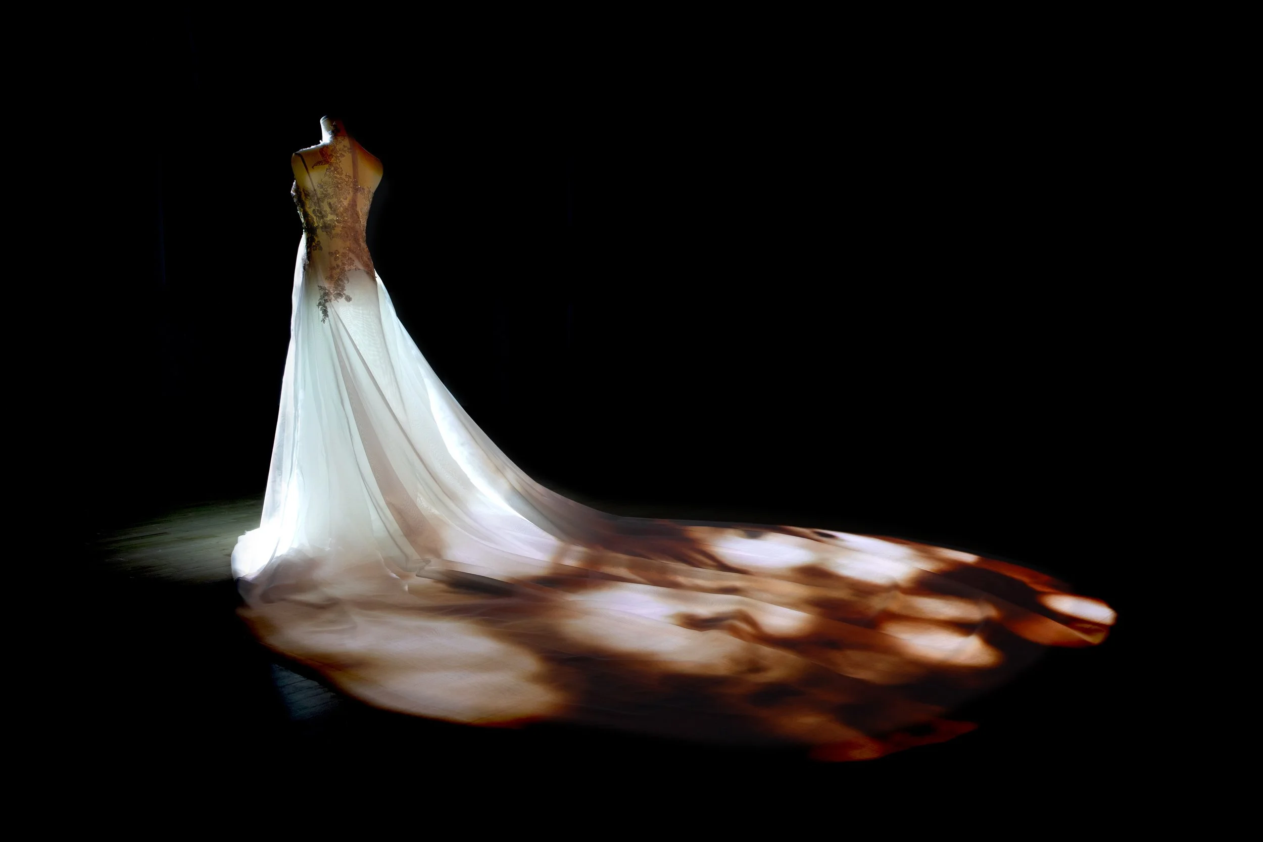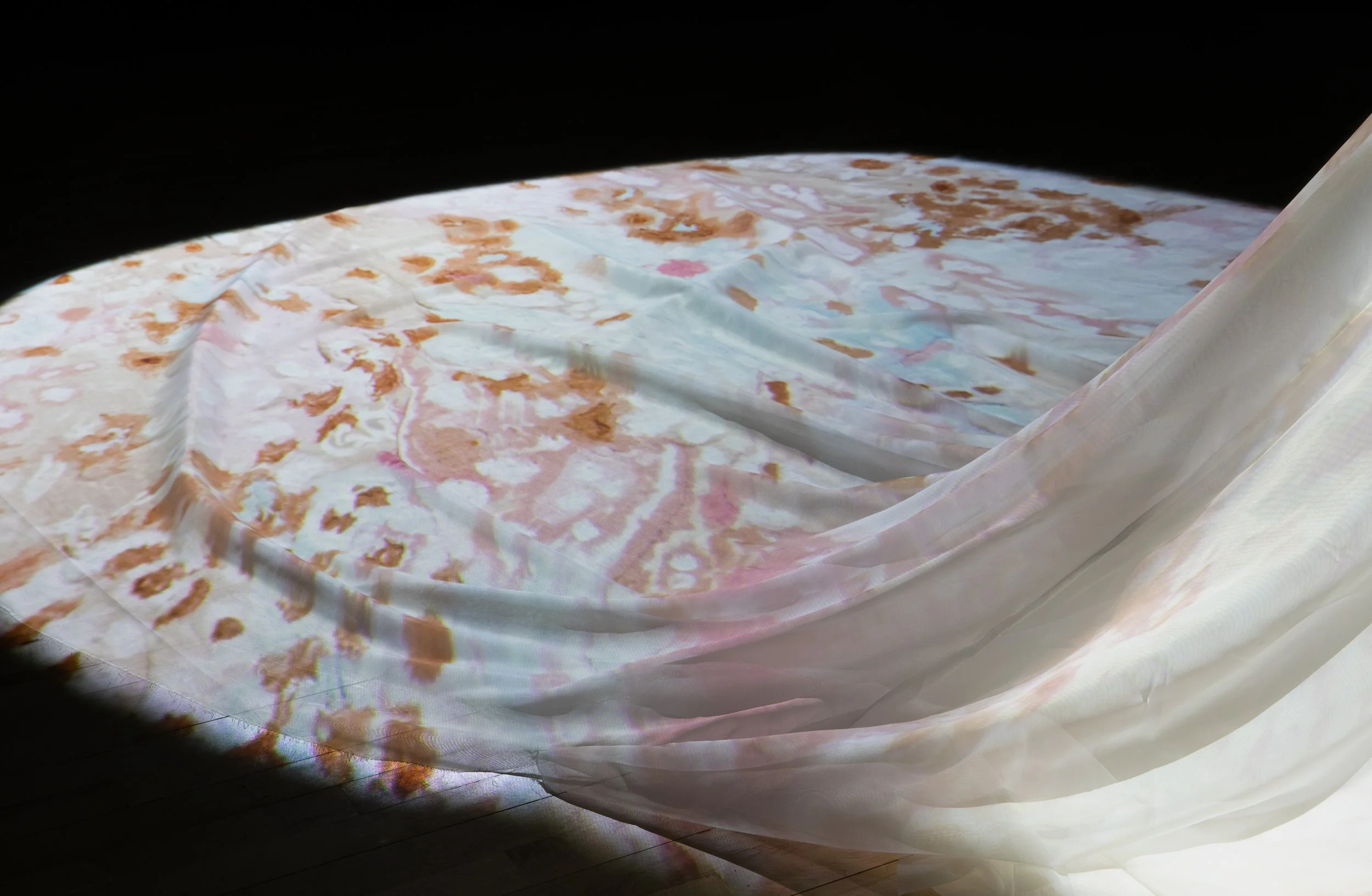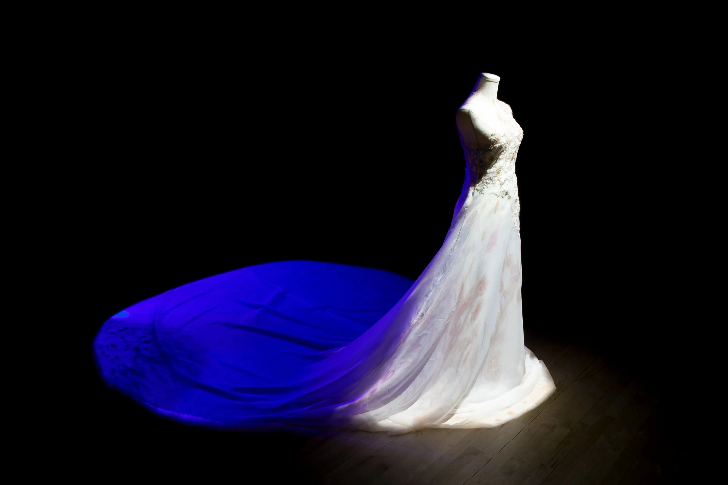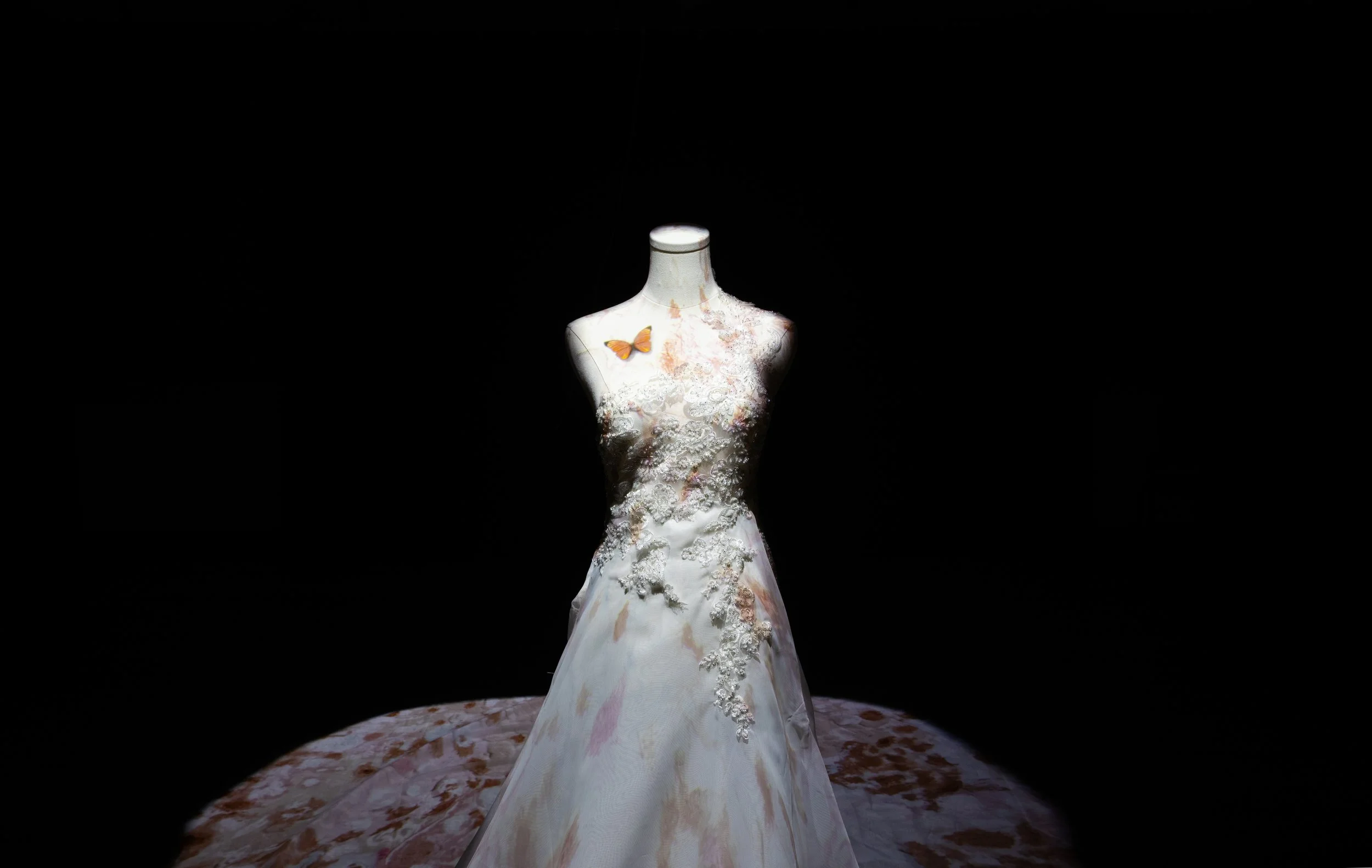 Ophrys Apifera is a video sculpture that examines the nature of love as an inherently subjective act of projection and the relationship between the subject and the object of affection. At the center of a dark, empty room stands a pure white wedding dress sculpture. Two projectors cast colorful, dynamic imagery onto the dress and its flowing train, transforming it into a canvas for layered emotions and shifting visions.